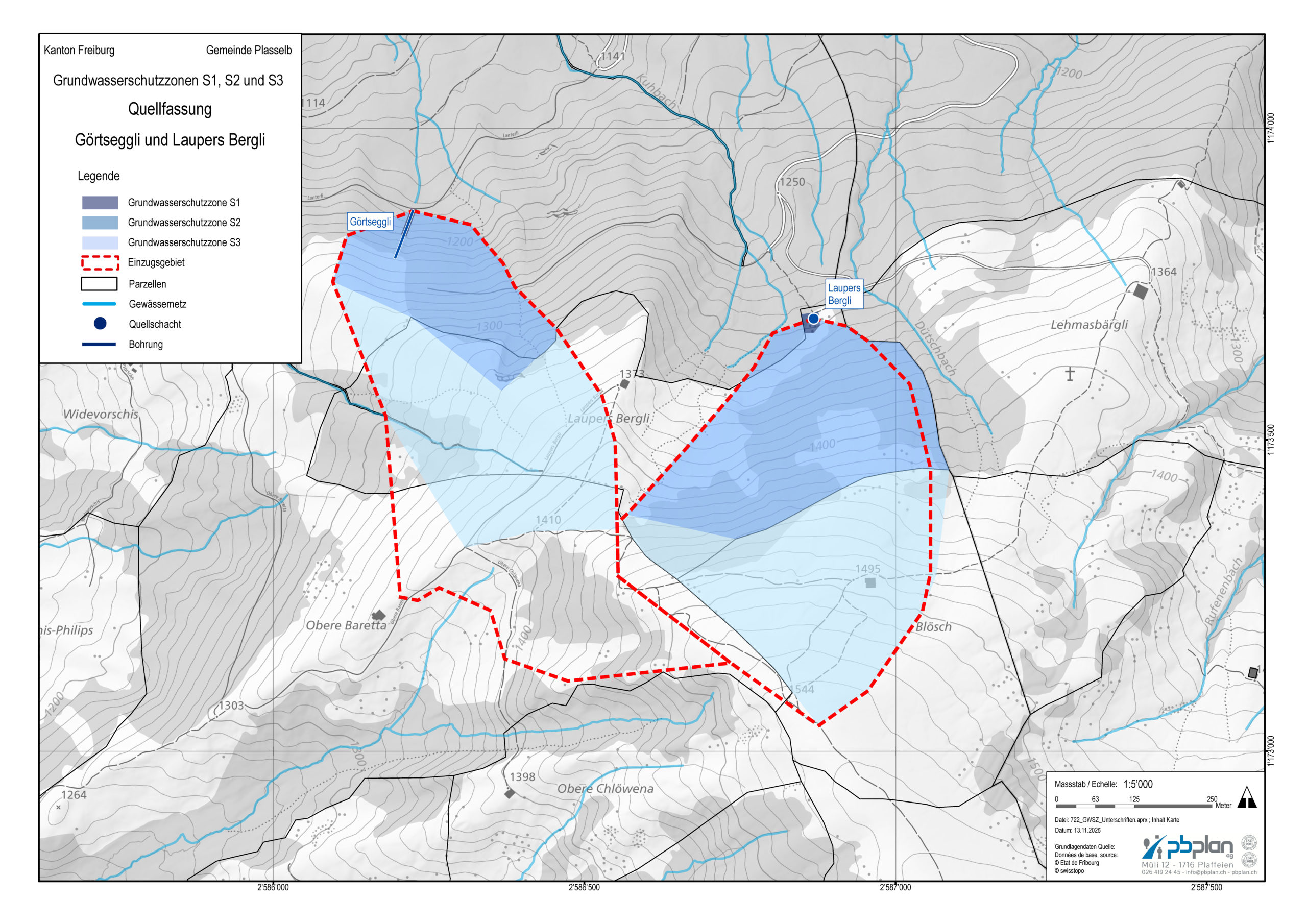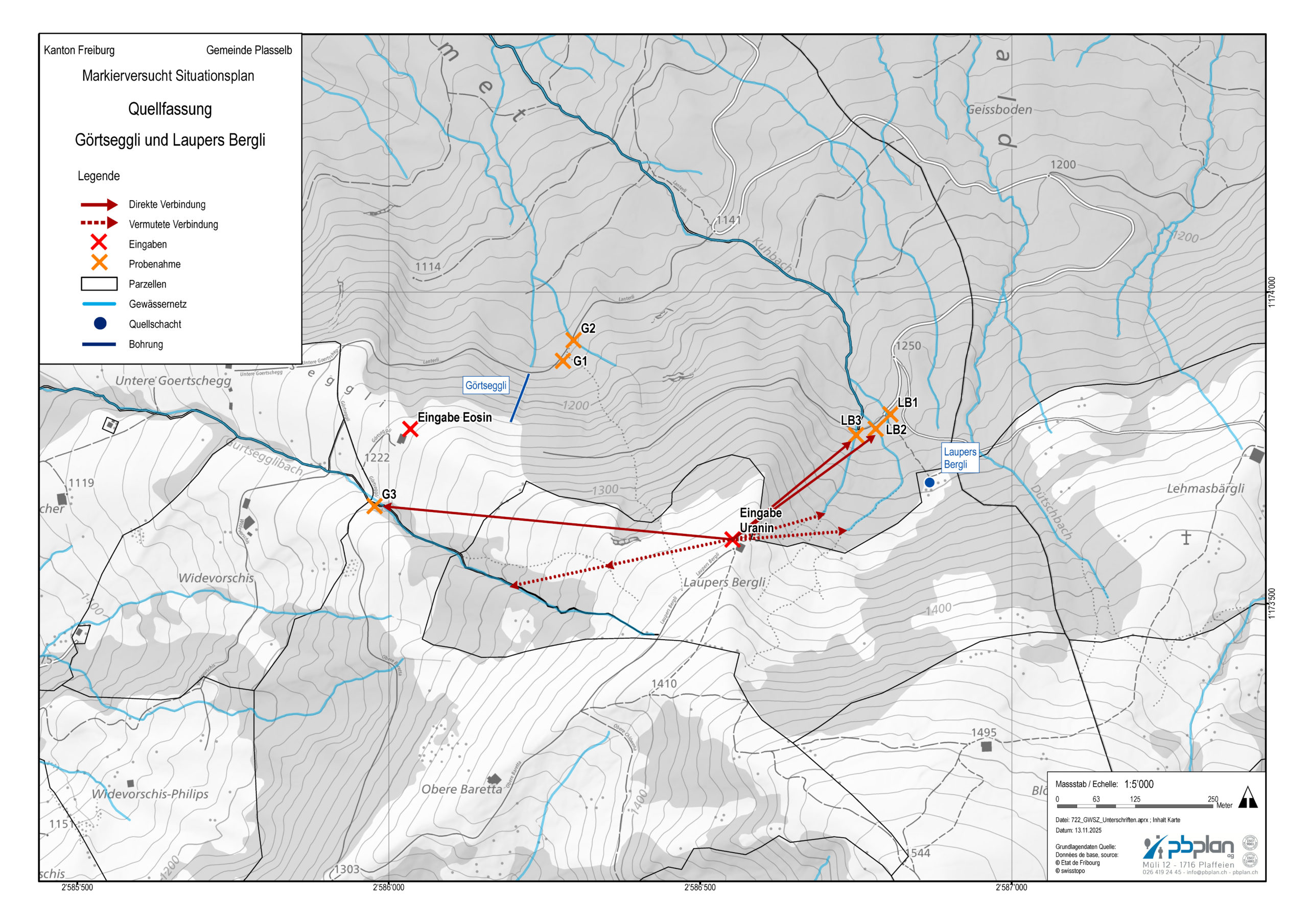 Pour vérifier la délimitation des zones de protection des eaux souterraines encore non approuvée des sources de Görtseggli et de Laupers Bergli nous avons analysé les conditions hydrogéologiques locales, déterminé les bassins versants des sources et défini les zones de protection des eaux souterraines S1, S2 et S3 conformément aux directives cantonales et fédérales en vigueur. À cette fin, un essai de traçage ainsi qu’une surveillance des sources pendant six mois ont été menés. Les résultats ont ensuite permis d’élaborer un modèle hydrogéologique conceptuel.