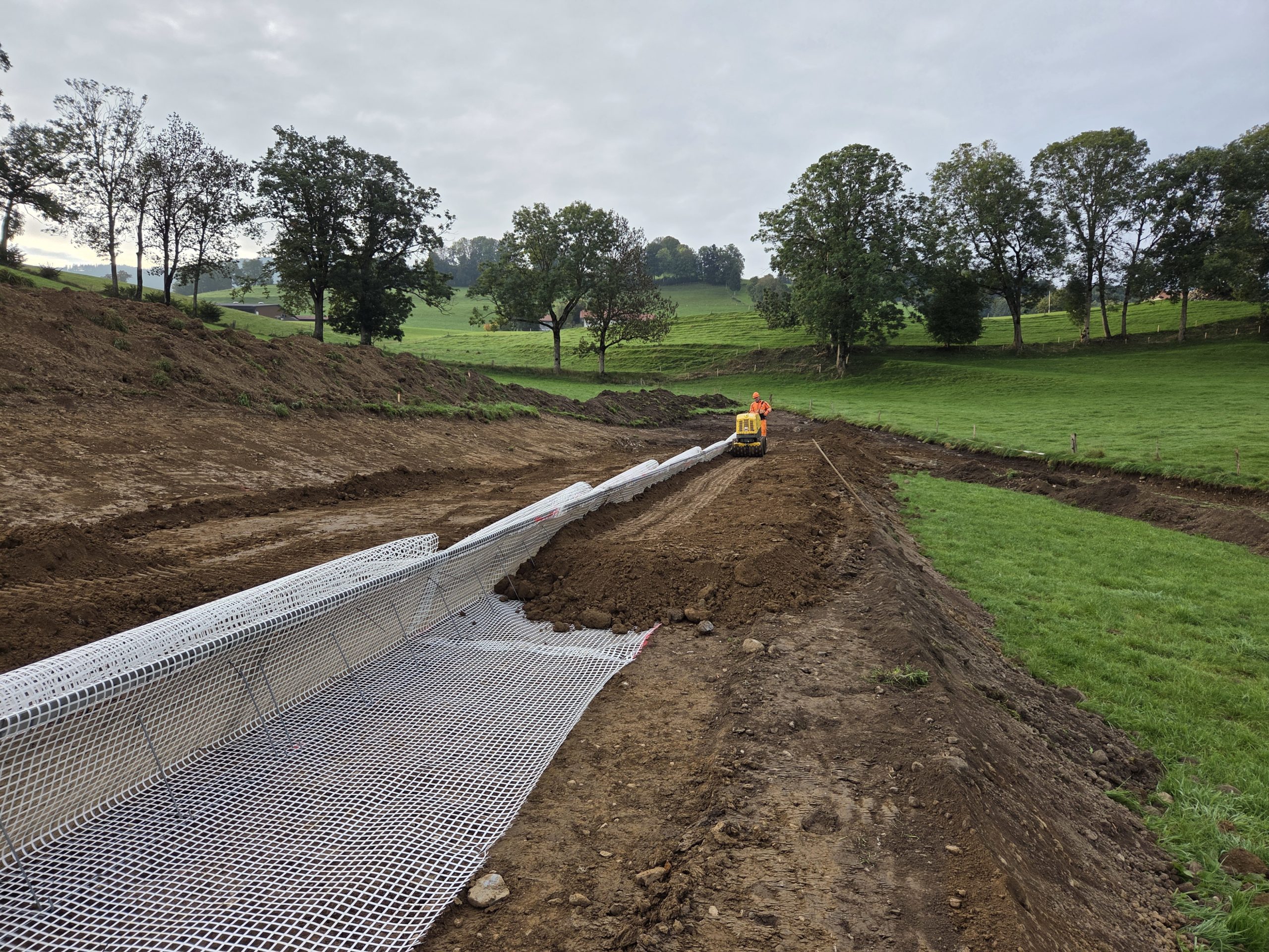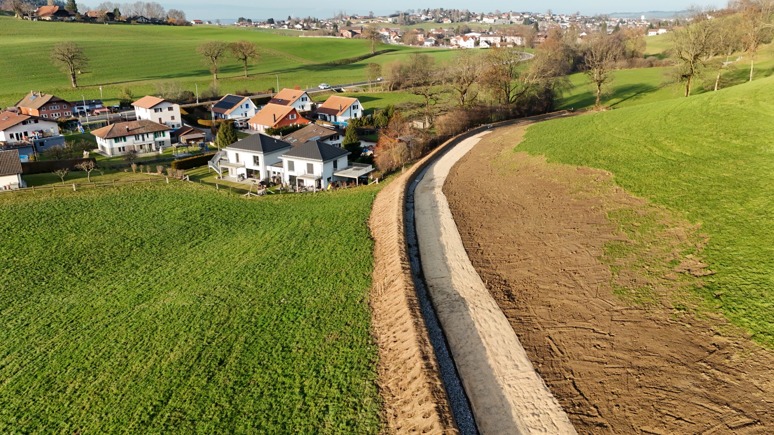 Unser Büro hat mehrere Varianten geprüft und das Projekt optimiert, um die Auswirkungen auf den Boden, die landwirtschaftliche Nutzung und die Landschaft so gering wie möglich zu halten. Entlang des Damms wurde eine Hecke gepflanzt, um die Biodiversität zu fördern.